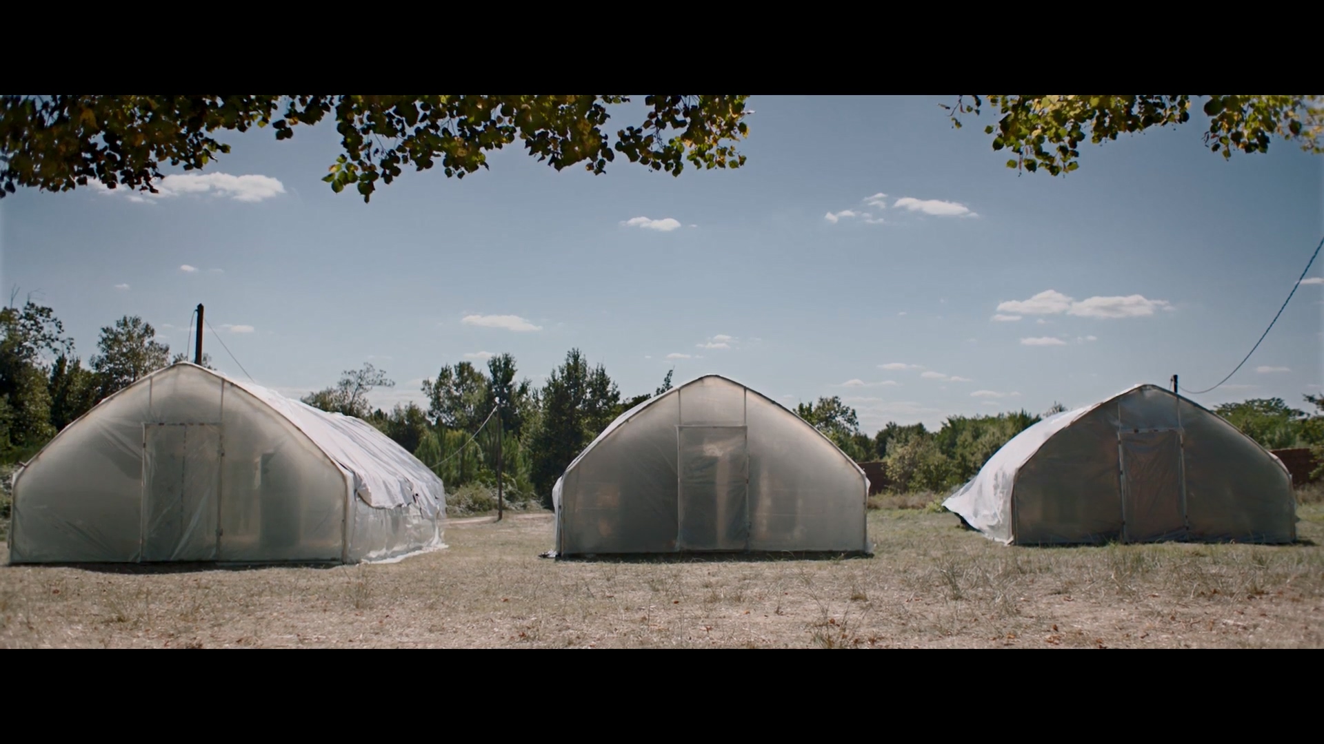 딸이 양식 비닐하우스 하나를 찢어버리고 메뚜기가 날아갑니다.