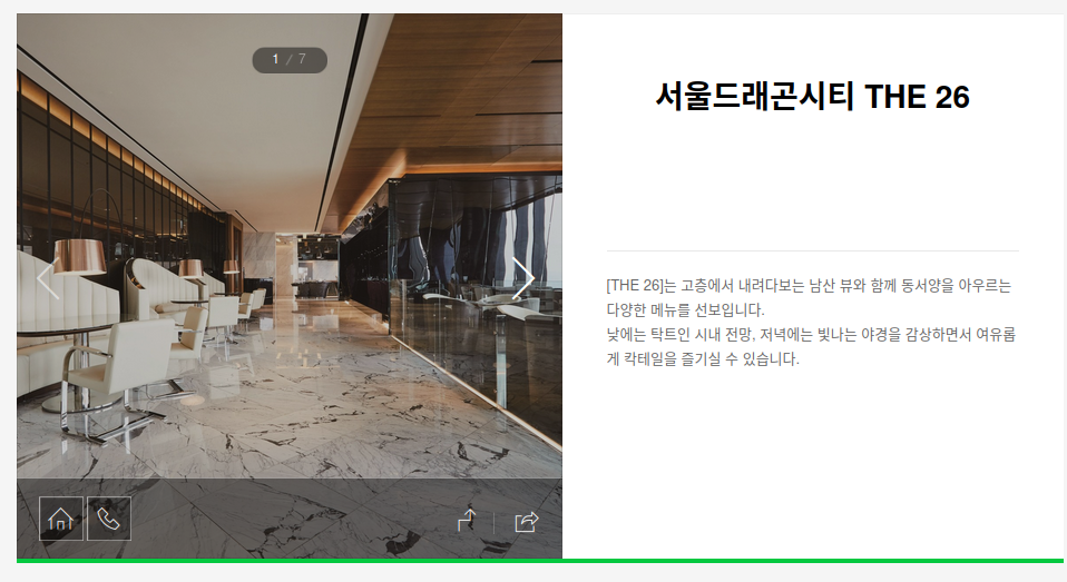 [THE 26]는 고층에서 내려다보는 남산 뷰와 함께 동서양을 아우르는 다양한 메뉴를 선보입니다. 낮에는 탁트인 시내 전망, 저녁에는 빛나는 야경을 감상하면서 여유롭게 칵테일을 즐기실 수 있습