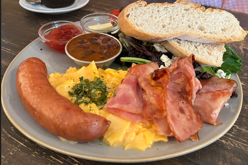 빵을 안 먹는 아들을 위해 소세지와 베이컨을 주문했습니다.