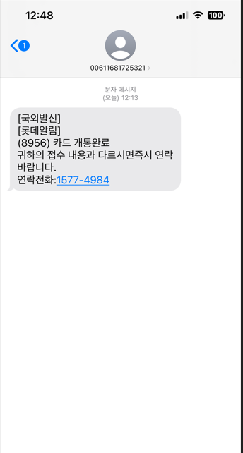 '[국외발신][롯데알림](8956) 카드 개통완료 귀하의 접수 내용과 다르시면즉시 연락바랍니다. 연락번호:1577-4984'