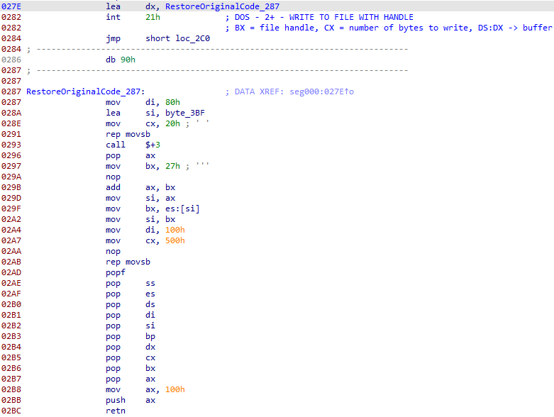 복구 코드는 바이러스 내에 존재하므로 굳이 감염된 파일 끝에 추가하지 말고, 바이러스가 실행될 때 메모리 내에서 해당 코드를 복사하면 될 겁니다.