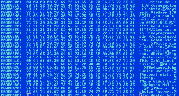 | Virdem Ver.: 1.0 (Generation 1) aktiv. Kopireid VirWare 1986 If you can't help yourself, try 05932/5451 !!!!! Good luck !!!!! Dies ist ein Demoprogramm fur Computerviren. Geben Sie nun bitte eine Zahl ein. Wenn Sie richtig raten, d걊fen Sie Weiterarbeiten Die Zahl liegt zwischen 0 und Bedauerlicherweise war Ihre Antwort nicht richtig. Mehr Gl갷k beim n꼊hsten Mal .... Bravo. Richtige Antwort. Sie d걊fen Weiterarbeiten. Alle Ihre Programme sind nun durchseucht. |
