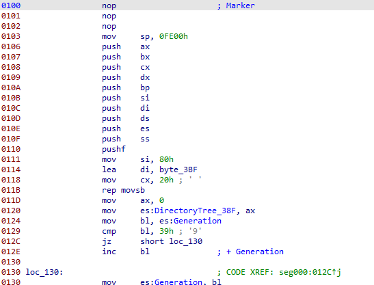 다른 변형은 감염 여부 확인을 위해 파일 시작이 NOP (90h)으로 시작하는지 검사하지만, 이 변형은 다른 부분을 확인합니다.
