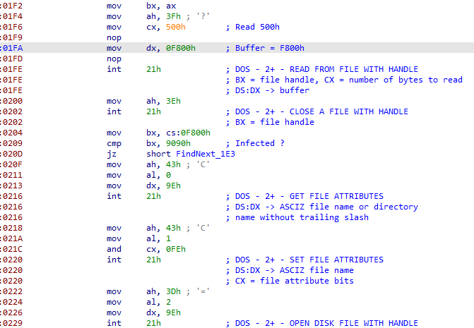 이 바이러스는 메모리 F800h 에 감염 시킬 파일을 읽어 들입니다.