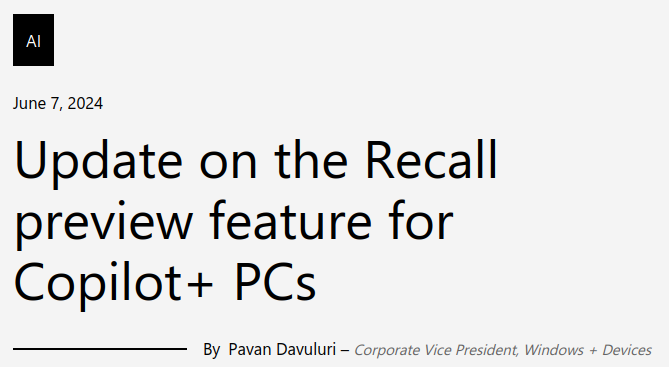 2024년 6월 사용자들의 보안과 사생활 침해에 대한 우려로 Recall 기능이 탑재된 컴퓨터의 출시는 연기되었습니다.