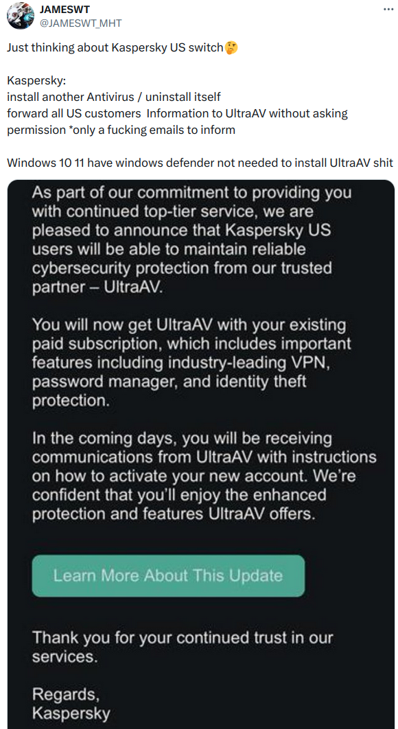 미국 Kaspersky 제품 사용자가 Ultra AV로 대체되었습니다. https://xcoolcat7.tistory.com/91211 Kaspersky, 미국 고객에 자사 제품 언인스톨 및 UltraAV 설치 논란미국 정부에서 미국 내에서 Kaspersky 제품 사용을