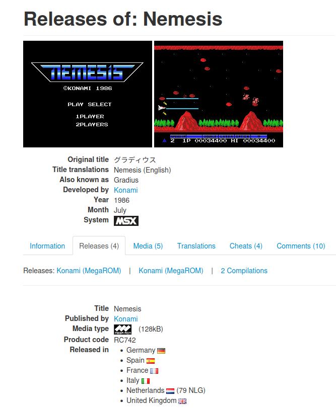 Nemesis (1986, MSX, Konami) | Releases