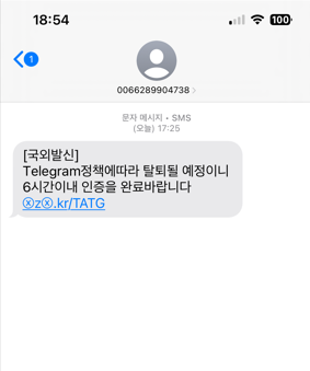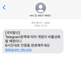 'Telegram정책에 따라 계정이 비활성화될 예정이니 6시간내로 인증을 완료해주세요 telegram-do.org'