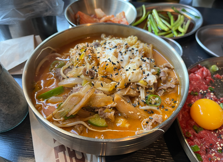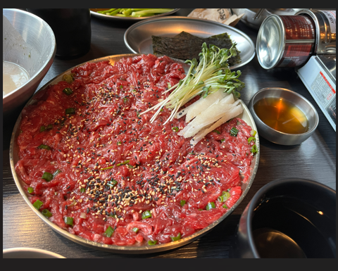 원래 초밥을 먹으려고 했지만, 아들이 육회가 먹고 싶다고해서 뭉티기에 갔습니다.