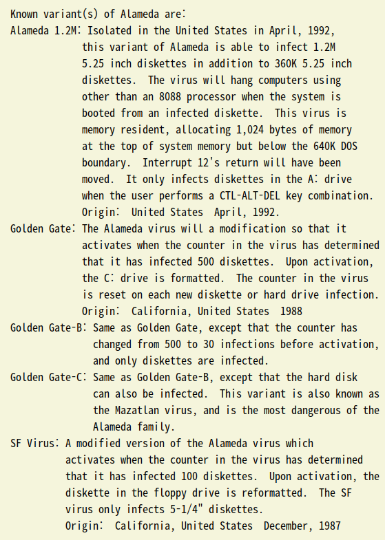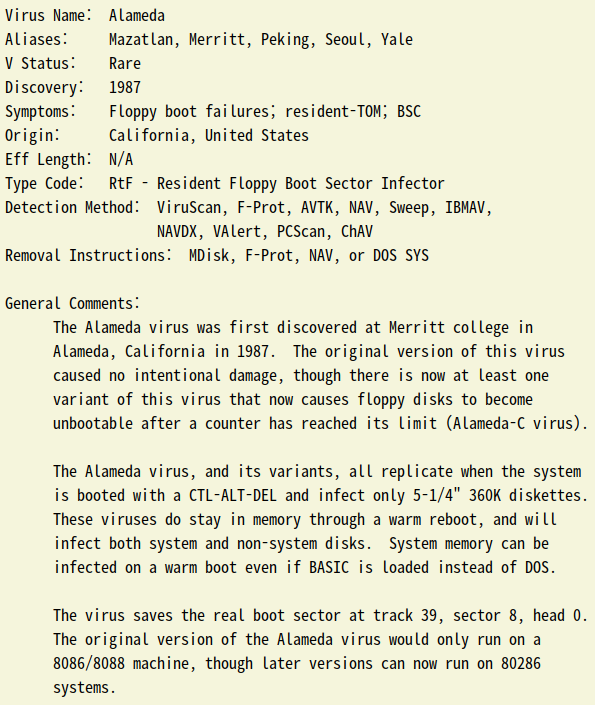 Virus Name: Alameda Aliases: Mazatlan, Merritt, Peking, Seoul, Yale V Status: Rare Discovery: 1987 Symptoms: Floppy boot failures; resident-TOM; BSC Origin: California, United States Eff Length: N/A Type Code: RtF - Resident Floppy Boot Sector Infector Det