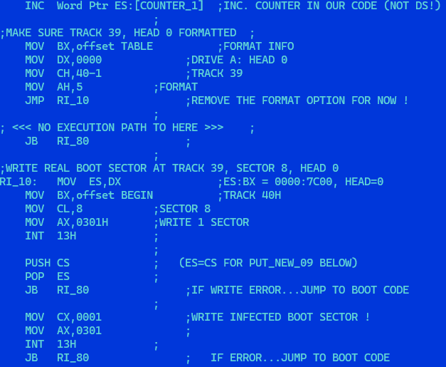 다른 부트 바이러스가 디스크 입출력을 담당하는 인터럽트 13h를 가로채는데, 이 바이러스는 키보드와 관련된 인터럽트 9을 가로채서 Ctrl + Alt + Del을 누를 때 발생하는 웜부팅을 가로챕니다.