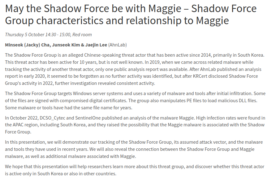 그리고, 그 내용은 2023년 Virus Bulletin 컨퍼런스에서 'May the Shadow Force be with Maggie – Shadow Force Group characteristics and relationship to Maggie' 로 발표했습니다.