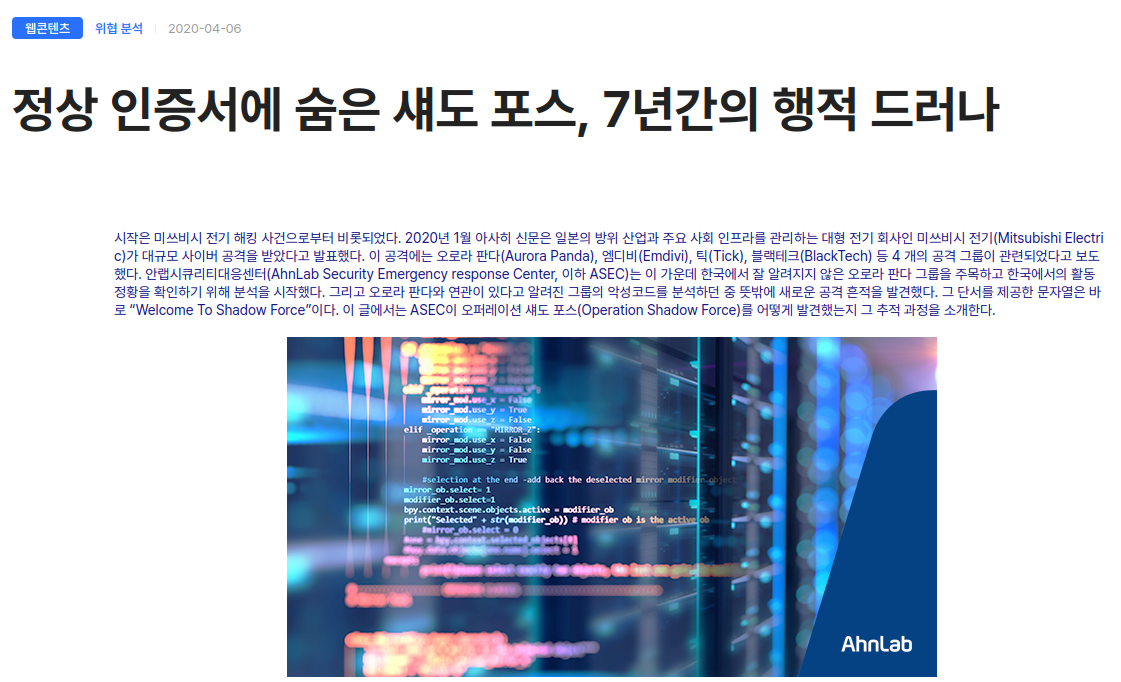 안랩(대표 강석균) ASEC(AhnLab SEcurity intelligence Center)과 국가사이버안보센터(NCSC)가 중국과 연관된 것으로 추정되는 APT 그룹 ‘TA-ShadowCricket(티에이 섀도우크리켓, 별칭-Shadow Force)’의 최근 ...