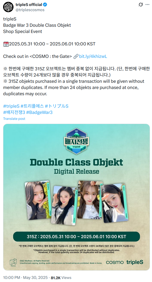 | (tripleS) 트리플에스 ASSEMBLE25, 2025 ... 완전체 컴백 (1) | 2025.05.18 |
