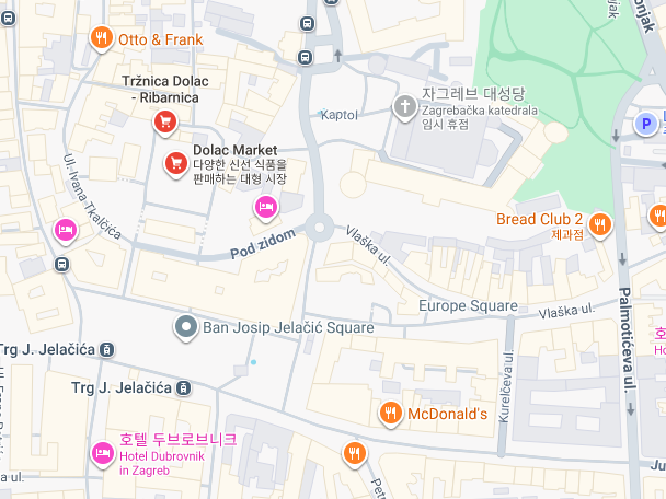 주변에 자그레브 대성당, 식당가, 관광지가 다 붙어 있습니다.