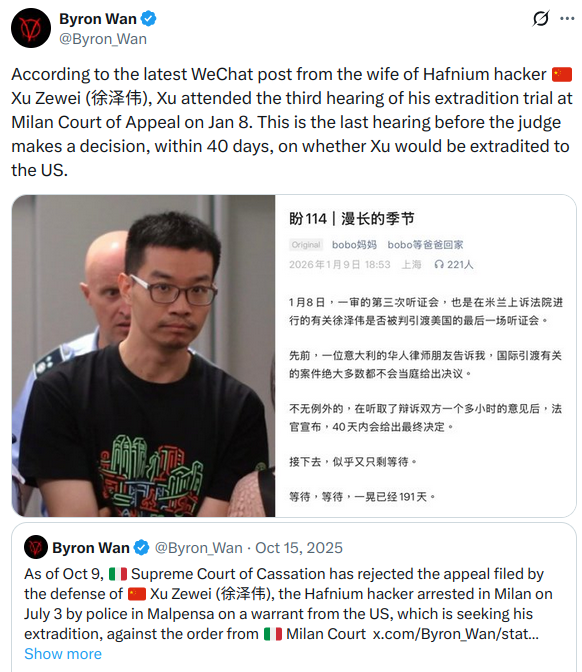 2025년 7월 3일 이탈리아 경찰은 밀라노 말펜사 공항에서 중국 상하이 출신 33세 쉬쩌웨이 ( 徐泽伟, Xu Zewei )씨를 체포했습니다. 미국 정부는 2020년 코로나19 백신과 관련해 미국의 민감 자료를 훔친 Silk Typhoon (Hafnium) 그룹 관계자로 의심하고 있습니다. Silk Typhoon (Hafnium) 그룹은 6만 개가 넘는 미국 기관을 표적으로 삼았고, 그중 1만 2,700개 이상에서 민감한 정보를 훔쳤다고 합니다.