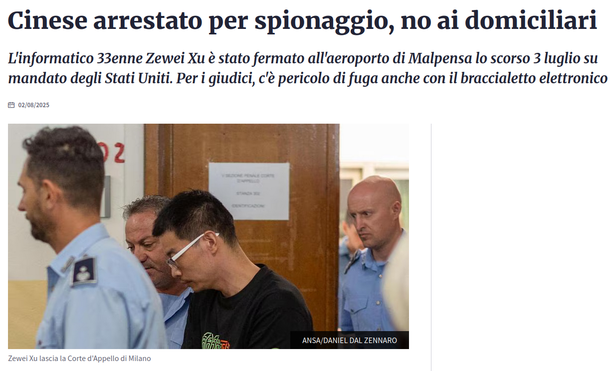 Cinese arrestato per spionaggio, no ai domiciliari (2025.08.02)