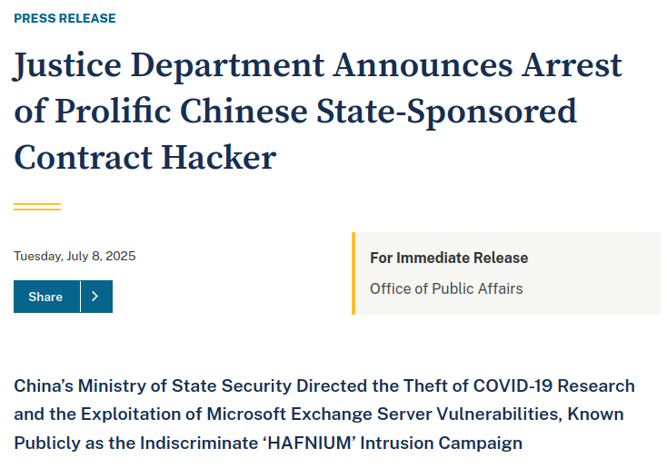 Justice Department Announces Arrest of Prolific Chinese State-Sponsored Contract Hacker (2025.07.08)