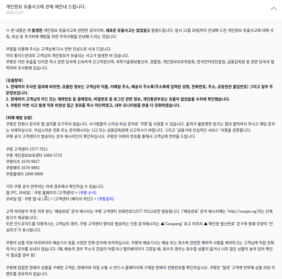 | 12월 7일 | 쿠팡, 개인정보 유출사고 재공지 | 노출 -> 유출로 변경 |