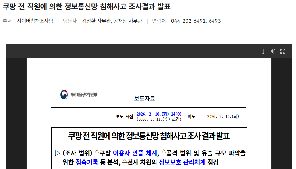 2026년 2월 11일 과학기술정보통신부는 침해사고 조사 결과가 발표됩니다.