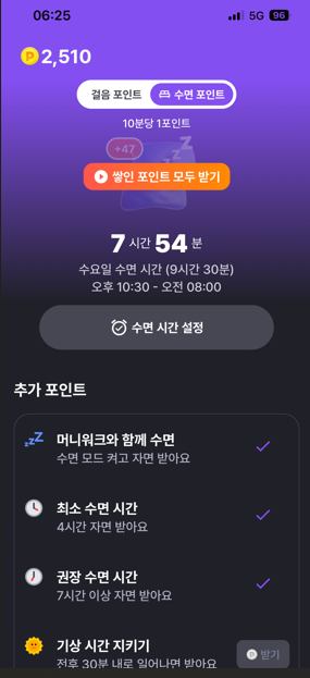 수면 시간 정해서 일어났을 때 포인트를 받을 수 있습니다.