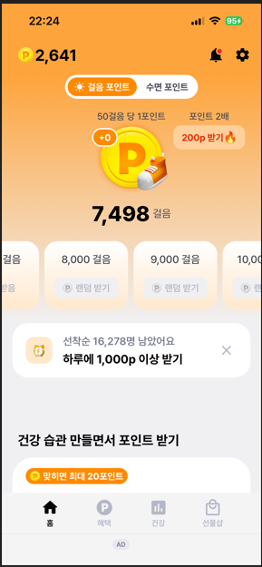 걸음 포인트도 광고 없이 버튼만 눌러주면 됩니다.