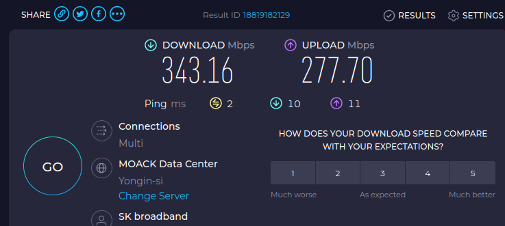 343.16 Mbps / 277.70 Mbps 정도 속도가 납니다.