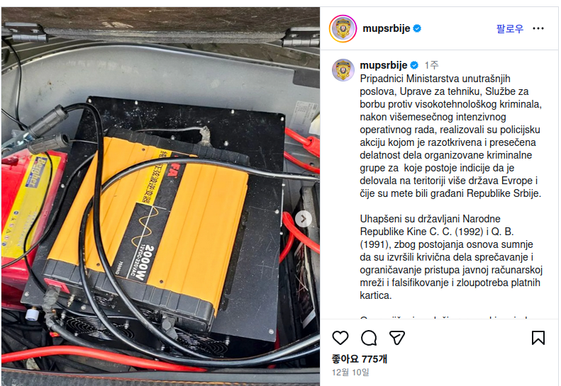 2025년 12월 10일 세르비아 당국은 공공 컴퓨터 네트워크 접근을 방해 및 제한하고 결제 카드를 위조 및 오용한 범죄 행위를 저지른 혐의로 중국인 2명을 체포했다고 밝혔습니다.
