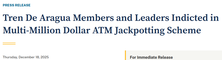 Tren De Aragua Members and Leaders Indicted in Multi-Million Dollar ATM Jackpotting Scheme (2025.12.18)