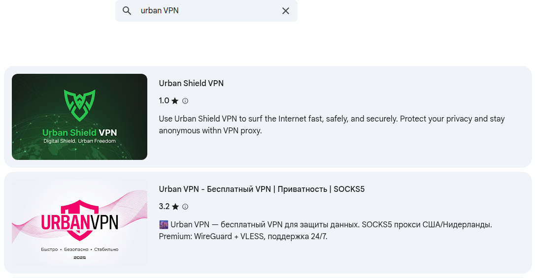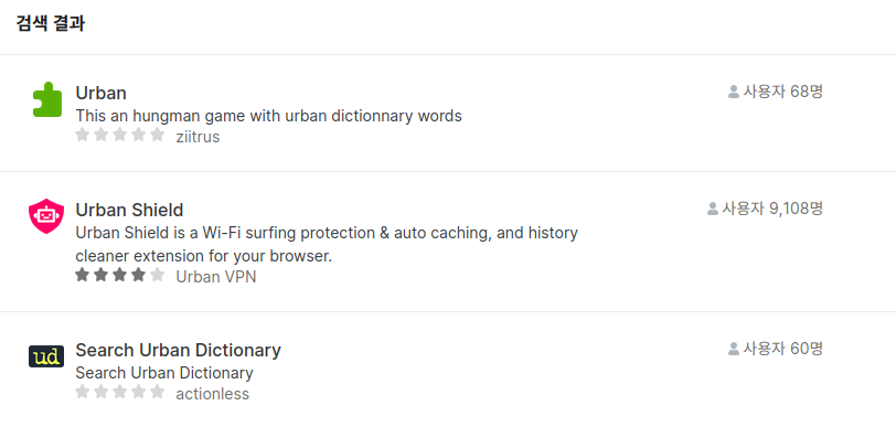 Chrome 검색 결과입니다. Urban VPN이 보이는데, 원래 프로그램과 아이콘이 다릅니다.