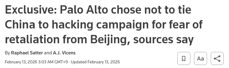 2026년 2월 13일 Palo Alto Networks가 앞으로 공격 주체에서 중국을 제외한다는 내용이 보도됩니다.