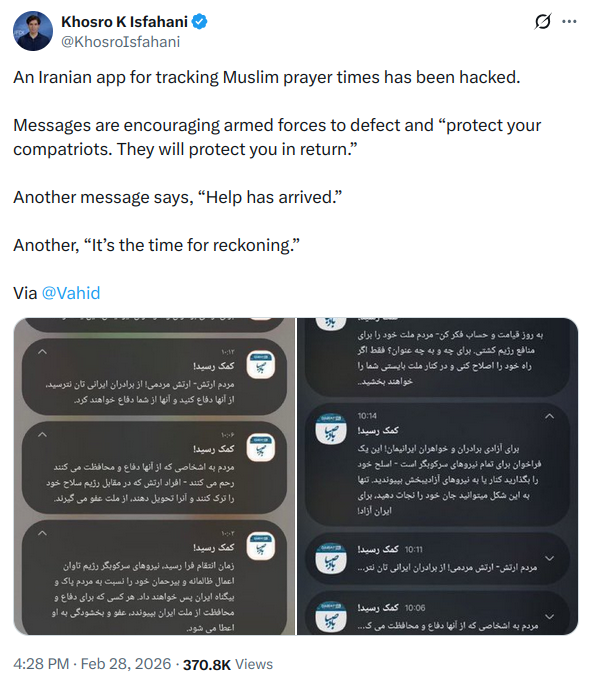 An Iranian app for tracking Muslim prayer times has been hacked. Messages are encouraging armed forces to defect and “protect your compatriots. They will protect you in return.” Another message says, “Help has arrived.” Another, “It’s the time