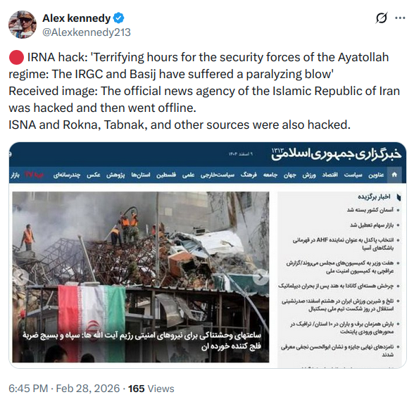 🔴 IRNA hack: 'Terrifying hours for the security forces of the Ayatollah regime: The IRGC and Basij have suffered a paralyzing blow' Received image: The official news agency of the Islamic Republic of Iran was hacked and then went offline. ISNA and Rokna