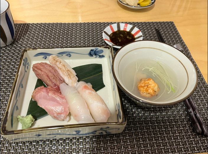 하나스시 . 031-696-1795 . 가격 : 점심 5만원, 저녁 10 만원 . 일요일 휴무 최소 3 번 가본 곳입니다. 점심 5만원, 저녁 10만원입니다. 가격은 좀 나가서 아무래도 외부 손님 올 때나 갈만합니다. 예전에는 3가지 중 선택이었던 것 같은데 요즘 오마카세 열풍(?) 때문인지 단일 메뉴네요. 룸이 있어 룸으로 들어갔습니다. 원산지 표시입니다. 뭔가 바뀐 것도 많나보네요. * 점심 메뉴 죽... 전복 ? 새우 초 ? 초밥입니다. 이걸 다 먹을 때만 해도 이제 밥은 끝인줄 알았습니다. 두번째 초밥입니다. (전 이미 배 부르기 시작해서 2개는 나눠줬습니다.) .... 또... 튀김 우동. 면이 쫄깃하고 국물이 깊은 맛이었습니다. (우동이 꽤 맛있었나봅니다. 초밥 빼고 기억에 남네요.) 후식으로..