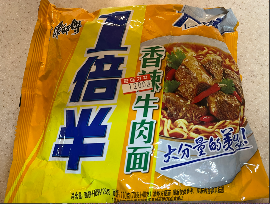 캉스푸 향리뉴유면 . 강사부 향라우육면 . Kangshifu Hot Beef Noodle 제품에는 '캉스푸 향리뉴유면'이라고 적혀 있는데 한자리를 우리식으로 읽으면 '강사부 향라우육면'인가 봅니다. . 내용량 : 128 g (590 kcal) * 요리 설명에는 끓는 물 500ml이라고 되어 있는데 실제 끓여서보면 물이 살짝 부족해 보입니다. 아니면 면이 물을 다 빨아들인걸까요 ? 양이 좀 많은 듯 해 한국라면보다 양이 많은 줄 알았는데 큰 차이는 없더군요. 고수를 넣어 봤는데, 사진에 보니 고수를 넣어 먹네요. * 맛 끝맛은 동남아 지역의 향신료 같은 맛(?)이 살짝 느껴집니다. 하지만, 강하지 않아서 초심자도 잘 먹을 수 있을 듯 합니다. 저는 여기에 버섯, 계란, 고수 넣었습니다. (한국에 파는 고수..
