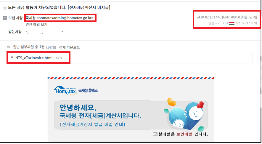 며칠전 애플 연체를 가장한 피싱 문자를 받았습니다. https://xcoolcat7.tistory.com/1481 애플 연체를 가장한 피싱 문자 001-1811-3179에서 문자가 하나 왔습니다. [국외발신] [계산서 도우미] 귀하의 Apple id에 연체된 계산서가 있습니다.로그인 확인:id.apid-sla.cc 파이어폭스로 접속하면 이미 의심스러운 사이트로 등록되 xcoolcat7.tistory.com 아내가 회사 메일로 국세청에서 메일 왔는데 한번 확인해 달라고 했습니다. 메일 주소도 hometax.go.kr로 진짜인가 싶었습니다. 하지만, 자세히 보면 이상한점 이 있습니다. 보낸 곳이 헝가리 입니다. 한국 정부에서 헝가리 시스템으로 메일 보낼 일이 없죠. 그리고, 발급일자가 2019년 입니다. 첨..