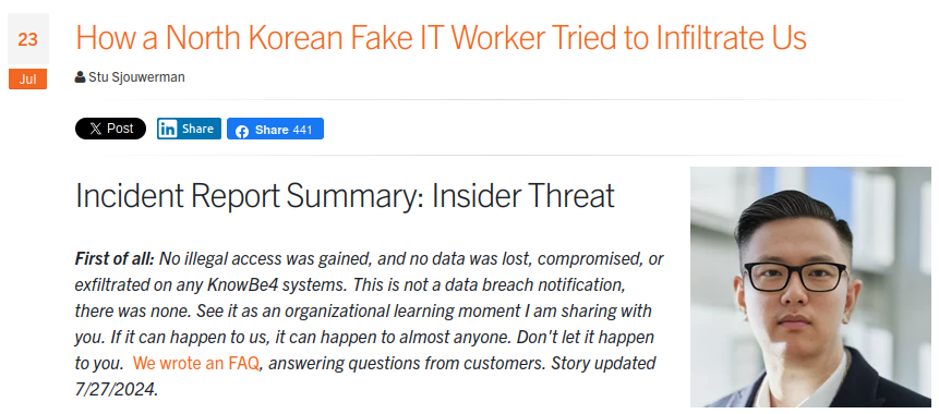 북한 IT 인력은 북한 정부의 무기 개발 자금 확보 및 해킹과의 연관성이 계속 의심받고 있습니다. 북한 정부와 연계된 북한 IT 인력이 개발자로 근무할 경우 회사 내부 상황 수집, 소프트웨어 취약점 파악, 공급망 공격 등을 시도 할 수 있습니다.외국은 원격 근무가 많아서, 문서 위조 뿐 아니라 딥페이크 (Deepfake)을 이용해 온라인 면접 할 때도 신분을 위장 할 수 있습니다. * 북한 IT 인력 위장 취업 2023년 10월 미국 법무부 (Justice Department)는 북한이 위조 신분을 사용해 프리랜서 IT 직원으로 취업했으며, 속임수를 통해 얻은 자금 약 150 만 달러와 일부 직원을 홍보하는 데 사용된 웹사이트 도메인 17개를 압수했고 밝혔습니다.FBI 관계자는 기업이 인터뷰 대상자를..