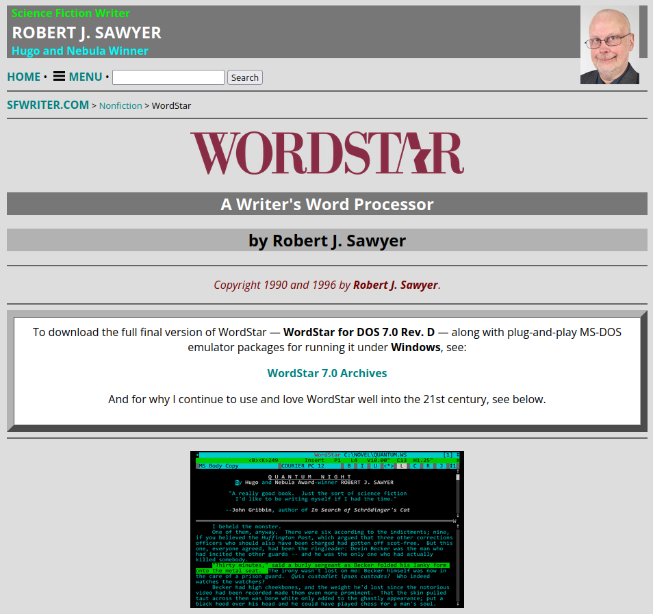 도스 시절 워드프로세스 프로그램인 워드스타 (WordStar) 7 가 공개되었습니다. https://sfwriter.com/wordstar.htm Robert J. Sawyer: Hugo and Nebula Award-Winning Science Fiction WriterAuthor of 24 bestselling novels including The Oppenheimer Alternative and FlashForwardsfwriter.com * 워드스타 워드스타는 마이크로프로 인터내셔널의 워드프로세서 프로그램입니다.(이름만 들어봤지 실제로 사용해본건 이번이 처음입니다.) . 워드스타 위키백과https://ko.wikipedia.org/wiki/%EC%9B%8C%EB%93%9C%EC%8A%A4%E..