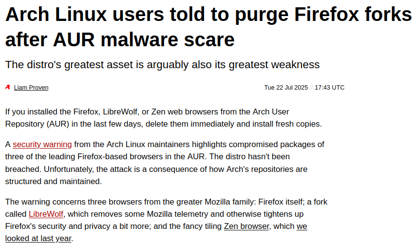 Arch 리눅스는 스팀OS 3에서 사용되어 게이머들이 많이 사용하고 있습니다.https://namu.wiki/w/SteamOS SteamOS밸브 코퍼레이션 이 개발한 게임에 특화된 컴퓨터 운영체제 이다. 상세 Arch Linux + KDE Plasnamu.wiki Arch 리눅스는 2025년 7월 16일 아치 사용자 저장소(Arch User Repository, AUR)에 악성 패키지가 업로드 되었다고 밝혔습니다.[SECURITY] firefox-patch-bin, librewolf-fix-bin and zen-browser-patched-bin AUR packages contain malwarehttps://lists.archlinux.org/archives/list/aur-general@lists.a..