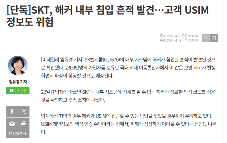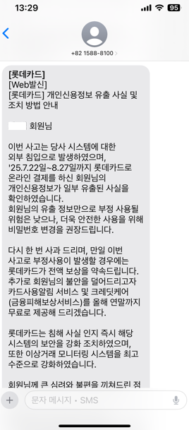 2025년 9월 1일 롯데카드 해킹이 보도되었습니다. [단독] '롯데카드' 해킹…보안 업계 "역대급 침해 사고"https://news.jtbc.co.kr/article/NB12261226 [단독] ‘롯데카드’ 해킹…보안 업계 "역대급 침해 사고"960만 명 넘는 회원을 보유한 롯데 카드사가 해킹됐습니다. SKT 해킹으로 2600만 건 넘는 유심 정보가 유출에 이어 또다른 해킹 사고입...news.jtbc.co.kr 그리고 이어진 KT 해킹 사건으로 롯데카드 해킹은 조용히(?) 잊어졌습니다. 9월 18일 롯데카드는 개인정보 유출을 알립니다. 개인정보가 유출되었다는 문자를 받았습니다. 롯데카드 개인신용정보 유출 사고 나무위키https://namu.wiki/w/%EB%A1%AF%EB%8D%B0%EC%..