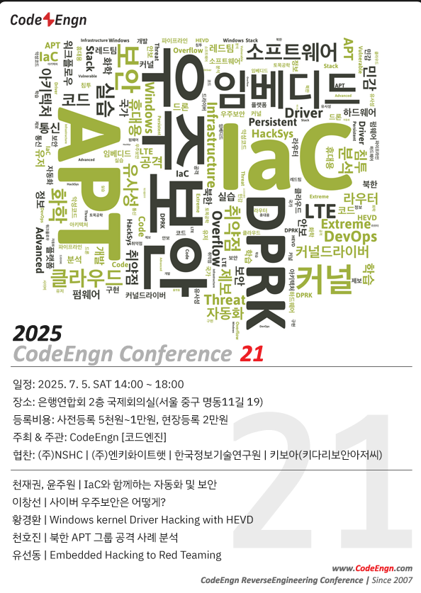 코드엔진 (CodeEngn) 컨퍼런스 코드엔진 컨퍼런스는 리버스엔지니어링 컨퍼런스로 기술적인 내용을 담고 있습니다. 코드엔진은 15년 전에 참석했었네요.https://xcoolcat7.tistory.com/711 코드엔진 2010(CodeEngn 2010)2010년 7월 3일 오후 코드엔진 2010(CodeEngn 2010)에 참가했습니다. 국내에 보안관련 세미나가 있는데 원론적인 얘기만하는 경우가 많은데 예전 발표 자료를 보니 꽤 알차더군요. 어느 정도 기대(!) 하xcoolcat7.tistory.com 여기서 3번 발표했는데, 아들이 어릴 때 마지막 참석했었습니다. https://xcoolcat7.tistory.com/772 7월 2일(토) 코드엔진 2011 개최올해 코드엔진에서 발표합니다. ht..